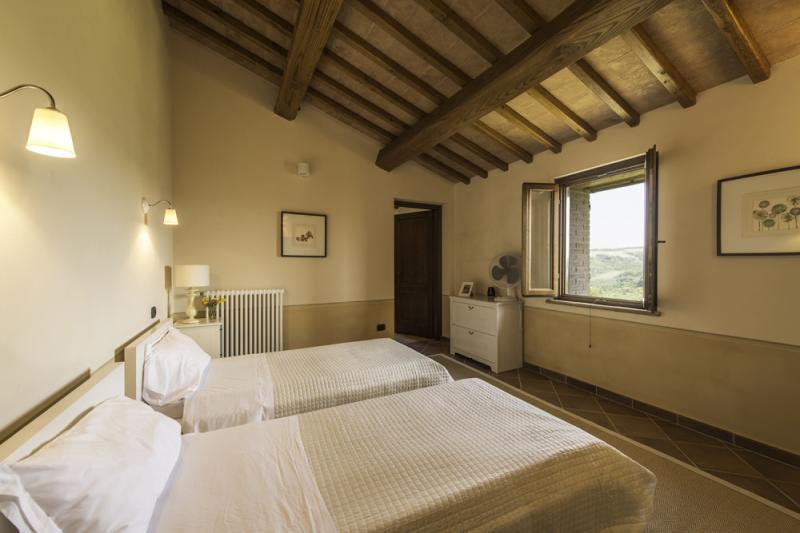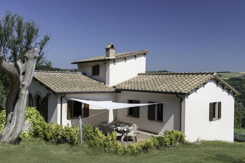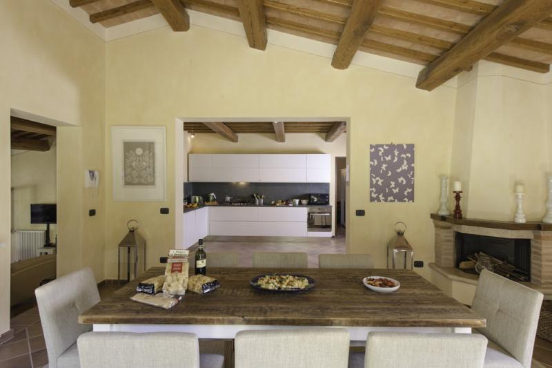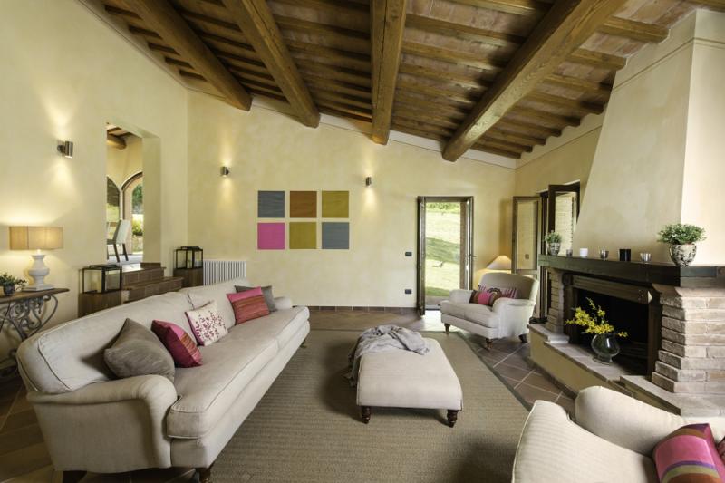 Conceived by an Anglo-Italian developer with the vision of a modern implementation of the classic Umbrian rural homestead, emphasising luxury and practicality alongside authenticity and atmosphere. The house measures 400sqm, with 30 sqm of covered "portico" in addition. The house is set on 3 levels. The ground floor incorporates: a large living room with 2 fireplaces, opening out onto the garden area; 2 bedrooms with ensuite bathrooms; and a further bathroom for the living area. On the first floor there are 2 bedrooms with ensuite bathrooms; walk-in wardrobe and fitness area. A wrought iron staircase leads up to the very intimate and private second floor with a light and airy studio-bedroom which enjoys superb open views. The house has been built externally with local stone and hand-made bricks. All ceilings are in traditional woodbeam and terracotta bricks. All floors are in modern quality tiles. Windows and doors are in wood with double glazing. Large garden with integrated irrigation system. Sold with 1.5 hectares (additional land available).